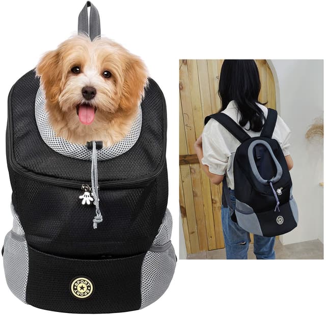 Bekväm och säker design: Genom öppningen på ryggsäckens topp kan ditt husdjur sticka ut huvudet, så att det kan andas och se sig omkring helt normalt. Hålet kan dras åt med ett snöre. I transportväskan finns en rem med karbinhake som du fäster på kopplet, så att hunden in kan falla eller hoppa ur ryggsäcken.