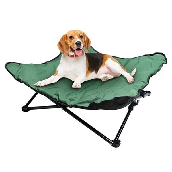Denna hundsäng på ben är den perfekta viloplatsen för din hund. Den höjer sig från golvet för att ge skydd mot drag och kyla, samtidigt som det slitstarka tyget i en lugnande grön färg erbjuder en mysig och inbjudande yta för din hund att vila på.