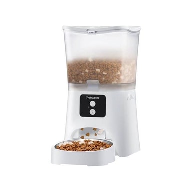 Specifikation - Modell: PF02-2 - Kapacitet: 3 l - Kompatibla foder: Torr, frystorkad, blandat (2–12 mm diameter) - Portionsstorlek: 8 g per portion - Antal måltider per dag: 1 till 6 - Strömförsörjning: 5 x AAA-batterier (ingår ej), 5V nätadapter - Anslutning: WiFi - Dimensioner: 25 x 19 x 38 cm - Vikt: 1,5 kg - Extra funktioner: Röstmeddelanden - Färg: Vit
