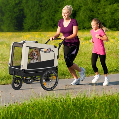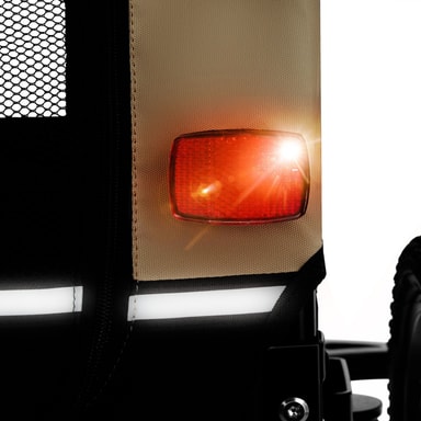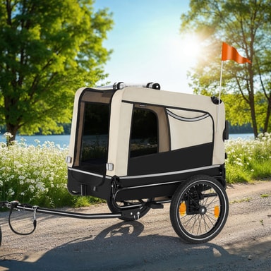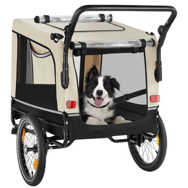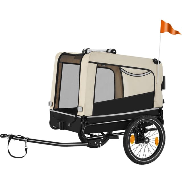 Ge ditt husdjur nya intryck och upplevelser varje dag med spännande utflykter i den bekväma hundvagnen WoofRider från tectake. Tack vare den infällbara dragstången, det snabbt monterade framhjulet och det avtagbara skjutreglaget kan vagnen enkelt förvandlas till en hundvagn för cykel på nolltid. De luftgenomsläppliga mesh-fönsterna ger din hund mycket frisk luft under färden, medan den halkfria botten ger extra säkerhet på resan. Utmärkt synlighet i trafiken garanteras med hjälp av reflexer, lysande detaljer och en medföljande varningsflagga, vilket gör att cykelvagnen WoofRider från tectake är perfekt utrustad för både stora och små äventyr med din fyrbenta vän.