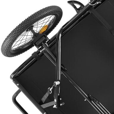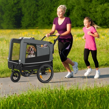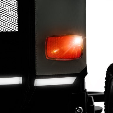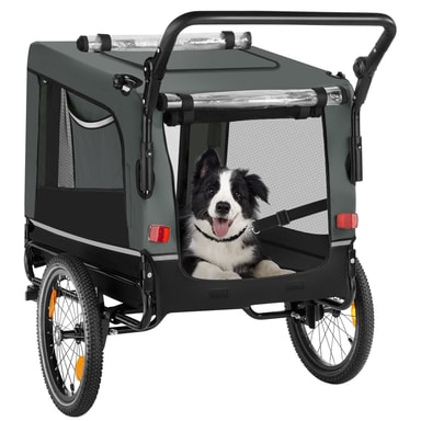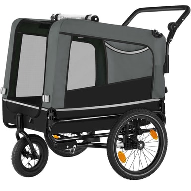 Ge ditt husdjur nya intryck och upplevelser varje dag med spännande utflykter i den bekväma hundvagnen WoofRider från tectake. Tack vare den infällbara dragstången, det snabbt monterade framhjulet och det avtagbara skjutreglaget kan vagnen enkelt förvandlas till en hundvagn för cykel på nolltid. De luftgenomsläppliga mesh-fönsterna ger din hund mycket frisk luft under färden, medan den halkfria botten ger extra säkerhet på resan. Utmärkt synlighet i trafiken garanteras med hjälp av reflexer, lysande detaljer och en medföljande varningsflagga, vilket gör att cykelvagnen WoofRider från tectake är perfekt utrustad för både stora och små äventyr med din fyrbenta vän.