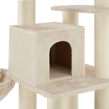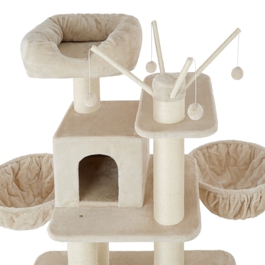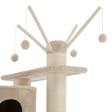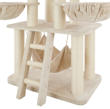 Detta vackra och stabila klösträd från tectake är ett klätterparadis som ger små kattungar och stora katter möjlighet att klättra mellan tre våningar. Detta klösträd har skramlande leksaksbollar som är roliga och spännande för din katt, medan liggplatserna och hängmattan inbjuder till att kela och slappna av. Katter älskar att klösa på de tjocka pelarna som är klädda med slitstarkt sisal. Lång hållbarhet och stabilitet kännetecknar detta klösträd från tectake - det perfekta valet för lekfulla katter.
