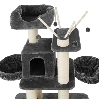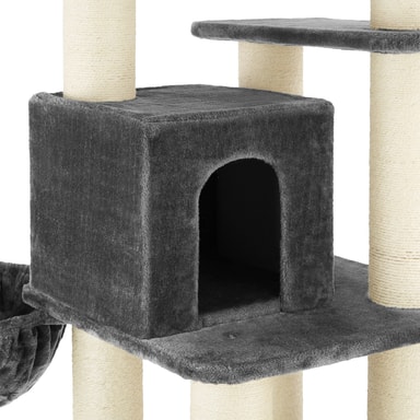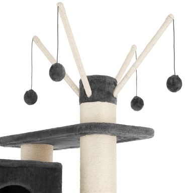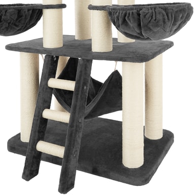 Detta vackra och stabila klösträd från tectake är ett klätterparadis som ger små kattungar och stora katter möjlighet att klättra mellan tre våningar. Detta klösträd har skramlande leksaksbollar som är roliga och spännande för din katt, medan liggplatserna och hängmattan inbjuder till att kela och slappna av. Katter älskar att klösa på de tjocka pelarna som är klädda med slitstarkt sisal. Lång hållbarhet och stabilitet kännetecknar detta klösträd från tectake - det perfekta valet för lekfulla katter.