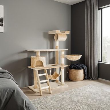 Vårt katträd är utrustat med robusta sisal-klöspelare, perfekta för att hålla kattens klor i toppskick. Med flera plattformar och olika viloplatser inklusive en hängmatta och en liggkudde, kommer din katt alltid att hitta en bekväm plats att vila på. Hängmattan är särskilt populär för små tupplurar efter en aktiv lekstund.