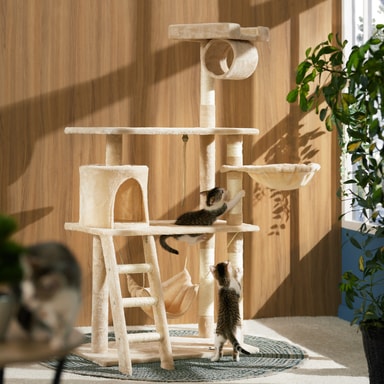Vårt katträd är utrustat med robusta sisal-klöspelare, perfekta för att hålla kattens klor i toppskick. Med flera plattformar och olika viloplatser inklusive en hängmatta och en liggkudde, kommer din katt alltid att hitta en bekväm plats att vila på. Hängmattan är särskilt populär för små tupplurar efter en aktiv lekstund.