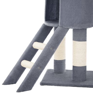 Höjdpunkten i detta klösträd är det rymliga katthuset, som erbjuder en trygg och skyddad miljö för dina katter att dra sig tillbaka till. Med en anslutande trappa är tillgången till katthuset enkel och smidig, vilket gör det till en perfekt plats för avkoppling och observation. Oavsett om din katt vill ta en tupplur eller bara ta en paus från den livliga leken, erbjuder detta katthus den perfekta tillflyktsorten.
