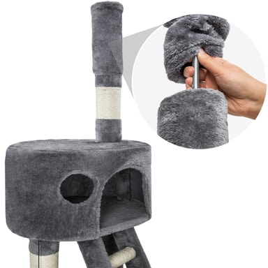 Högst upp på vårt kattträd finns en praktisk takspännare som kan justeras för att passa ditt rum, vilket ger en stabil och säker installation. Med en höjd som kan justeras mellan cirka 243 och 260 cm, är denna funktion ett utmärkt sätt att säkerställa att trädet är stadigt. För extra säkerhet ingår även ett lättmonterat tippskydd som snabbt och enkelt kan fästas i väggen med en plugg och en skruv. Detta gör att katträdet står tryggt även när din katt tar stora hopp eller leker vilt.