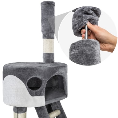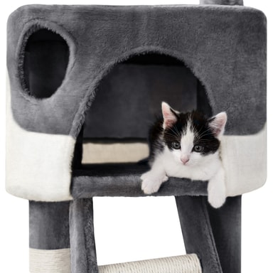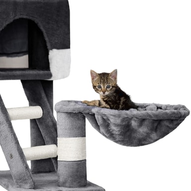 Inget katthem är komplett utan ett katträd, och vår modell har allt din katt behöver för både avkoppling och äventyr. Med två rymliga kattlådor att dra sig tillbaka i, flera olika nivåer och tre plattformar för vila och utsikt, kommer din katt att älska denna multifunktionella kattställning.