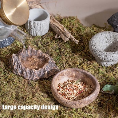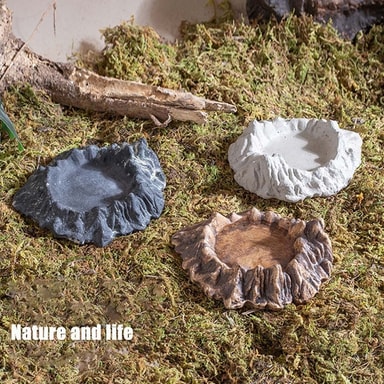 Realistisk trädstubbedesign: Denna matskål är utformad för att efterlikna en naturlig trädstubbe, vilket gör den till ett estetiskt tilltalande tillskott till alla terrarium. Den smälter sömlöst in i naturliga miljöer och ger dina reptiler en bekväm och säker plats att äta och dricka. Den realistiska designen bidrar också till att stimulera deras naturliga beteenden och berikar deras livsmiljö.