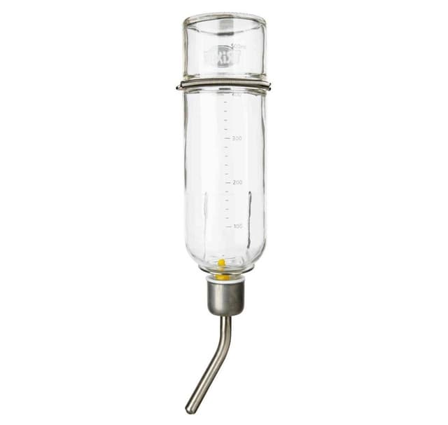 Vattenflaska av glas med metalllock/bitsäker flottör för sugrör möjliggör enkel kontroll av vattennivån säker fastsättning genom dragfjäder/spår och vajerhållare med kulventil