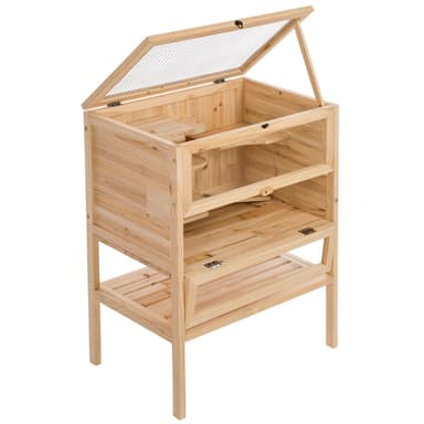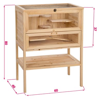 Detta stiliga hamsterbur ger dina små älsklingar ett perfekt hem. Hamsterburens fönstren i plastglas ger direkt insyn på alla plan. Taket i trådnät ger bra friskluftsintag och kan öppnas helt och hållet. Den undre delen av fronten kan öppnas vilket underlättar rengöringen av buren. Via en ramp kan djuret komma upp på de övre planen. Denna hamsterbur har dessutom en avställningsyta undertill, där till exempel foder och spån kan förvaras så att det hela tiden finns nära till hands.