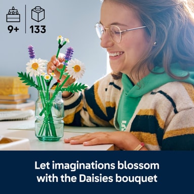• LEGO® BUKETT – Små florister kommer att ha roligt när de bygger 3 stora prästkragar, 2 stjälkar med små prästkragar, 3 lugnande lavendelblommor och livfulla gröna stjälkar