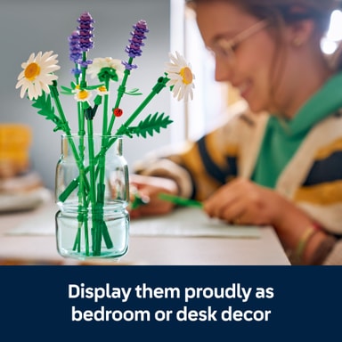 Flickor och pojkar kommer att ha massor av skoj när de skapar den söta buketten, som innehåller 3 stora prästkragar, 2 stjälkar med små prästkragar, 3 lugnande lavendelblommor och livfulla gröna stjälkar. Den lilla LEGO buketten erbjuder en perfekt balans mellan glädje och lugn och består av mycket realistiska blommor med en gullig lyckobringande nyckelpiga på en av lavendelstjälkarna, en söt detalj som garanterat kommer att glädja unga byggare. När den är klar kan barn stolt visa upp sin LEGO bukett som en vacker prydnad i sovrummet eller på skrivbordet, som varken vissnar eller behöver vattnas.