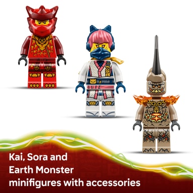 • TILLBEHÖR – Varje NINJAGO® minifigur har minst 1 vapen för ännu roligare lekar: Kai har 2 svärd, Sora har 2 svärd och jordmonstret har klor på händerna