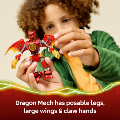 Pojkar, flickor och fans av tv-serien NINJAGO® Drakarna vaknar från 6 år kan ha roligt med fantasifulla lekar i timmar med byggsetet LEGO® NINJAGO Kais drakrobot – stridspaket (71851). Detta lekset innehåller en drakrobot med rörliga ben, stora vingar, klor och en överkropp som kan rotera 360 grader, plus en cockpit med plats för en minifigur.