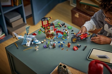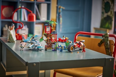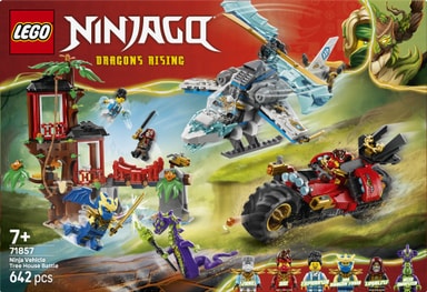 Pojkar och flickor från 7 år har allt de behöver för att iscensätta stridsaction med byggsetet Ninjornas fordonsstrid vid trädkojan (71857), som är baserat på säsong 4 av tv-serien NINJAGO® Drakarna vaknar. Detta lekset med stridsleksaker innehåller en trädkoja i tre våningar, en leksakshelikopter, en leksaksmotorcykel och 6 minifigurer.