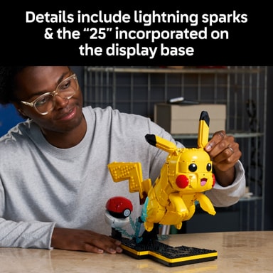 • DETALJER FÖR FANS – Visningsbasens knoppar bildar siffran "25", en blinkning till Pikachus Pokédex-nummer, och figuren står på ett blixtställ omgivet av gnistor, vilket står för typen Electric