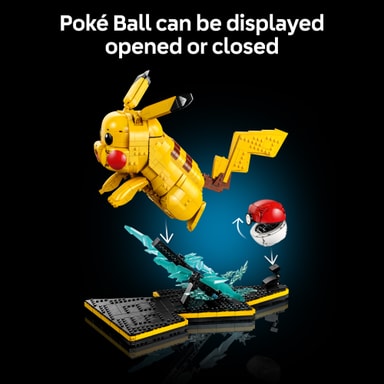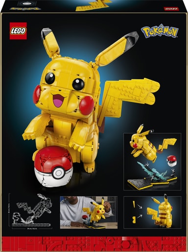 Detta LEGO® set med 2 050 delar innehåller massor av Pokémondetaljer och blir en perfekt present till vuxna som älskar söta speltillbehör och tv-spelsprylar. Denna gula modell av Pikachu med svarta öron och röda kinder är en färgglad spelsrumsdekoration med en svans som kan byggas för att visa den som hane eller hona. Bland de andra ikoniska detaljerna finns blixtar som symboliserar energireserverna hos denna Pokémon av typen Electric och siffran "25" på visningsbasen, som en blinkning till Pikachus Pokédex-nummer. Den rörliga figuren kan visas upp i en dynamisk stridsställning där den skjuts ut ur den öppna Poké Ball, som också kan visas upp i stängt läge när Pikachu är i viloställning.