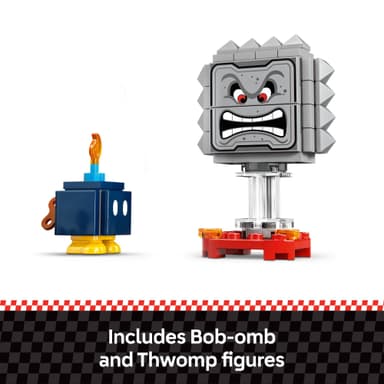 • En interaktiv LEGO Mario leksaksfigur, plus figurer av en Bob-omb och en Thwomp