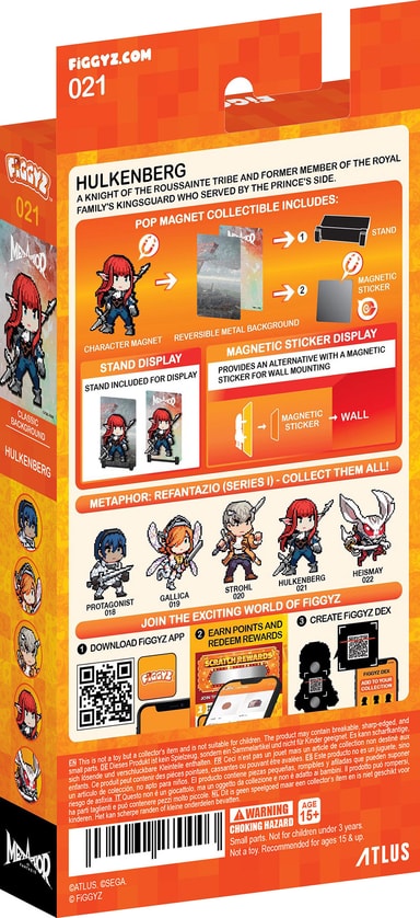 First 4 Figures Figgyz Metaphor ReFantazio Pop Magnet actionfigur har en vändbar metallplatta för två olika visningsalternativ, en pixelkonst-inspirerad karaktär, en 3D-magnetisk pop-out-effekt, en displaybas och en magnetisk dekal.Läs mer om produkten