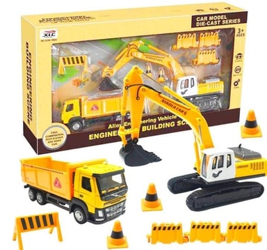 I detta set får du en liten byggarbetsplats med grävmaskin, lastbil, konor och staket!