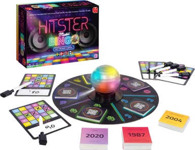 Jumbo Hitster Nordic Bingo är ett spel där du snurrar diskoklotet för att välja kategori, scannar låtkort, spelar låten och gissar årtionde, artist, år eller hittyp. Markera bingobrickan; först att fylla en rad/kolumn vinner.Läs mer om produkten