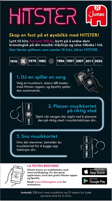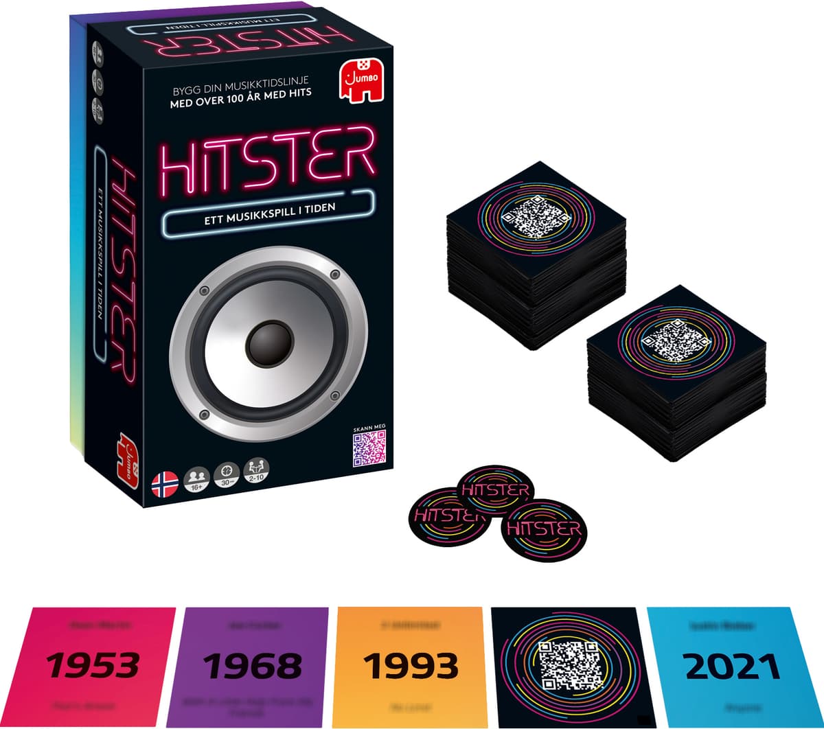Jumbo Hitster Original är ett musikfest-kortspel med hitlåtar från de senaste 100 åren. Använd appen för att skanna och spela låtar, gissa utgivningsår, artist eller ordna låtarna på en tidslinje.Läs mer om produkten