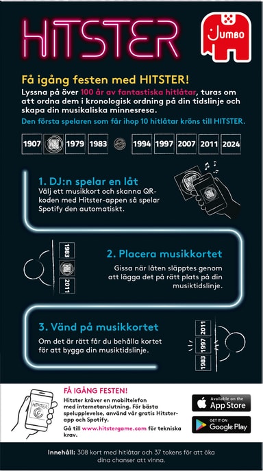 Jumbo Hitster Original Swedish Soundtracks är ett musikspel med hitlåtar från de senaste 100 åren. Använd appen för att skanna och spela låtar, gissa utgivningsår, artist eller placera låtarna i rätt tidsordning.Läs mer om produkten