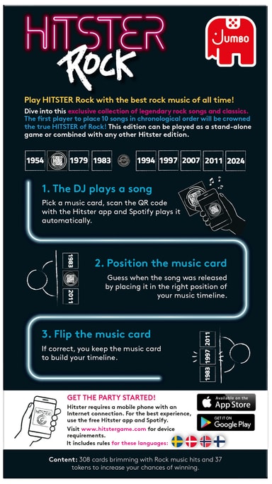 Jumbo Hitster Rock Soundtracks kortspel är ett roligt musikfestspel med 300 rocklåtar. Använd tillhörsappen för att skanna och spela låtar, gissa sedan utgivningsår, artist eller ordna låtarna på en tidslinje och den första till 10 rätt vinner.Läs mer om produkten