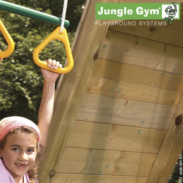 Barnen kan antingen hänga i de droppformade handtagen som ger maximal stabilitet, eller i stången däremellan. Bra Jungle Gym gunga som utvecklar styrkan och motoriken i armarna.