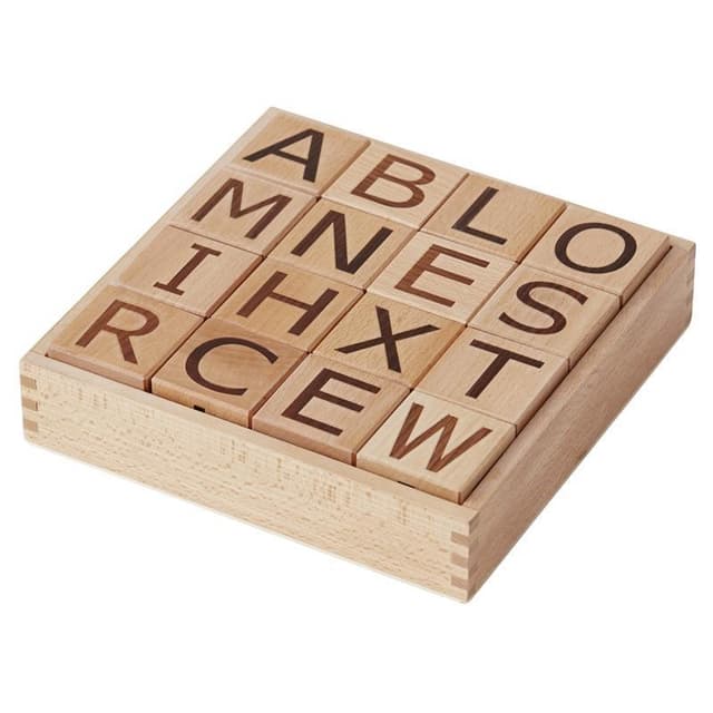 Naturfärgade träklossar med bokstäver på som är spännande att leka med både för att lära sig alfabetet och för att öva motoriken med.