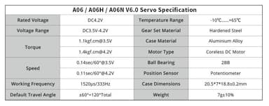 KST A06 V6 er en coreless digital mikroservo med dobble kulelager og aluminiumkasse. Servoen trekker 1,4kg på 4,2V og er kvikk med sine 0,11s. 8mm.Läs mer om produkten