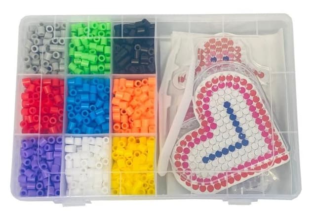 En låda med 1500 stycken skimrande rörpärlor i olika färger i detta kit ingår även två pärlplattor med mönsterkort, plastpincett, två nyckelringar och strykpapper.