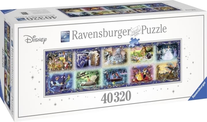 Är du redo för att lägga världens största pussel? Guinness World Records har bekräftat Ravensburger Disney Gravity-pusslet som det största kommersiellt tillgängliga pusslet i världen. Ravensburger Disney Gravity-pusslet är världens största, både vad gäller storlek och bitar. Detta enorma pussel består av tio minnesvärda Disney-klassiker. Motiven för illustrationerna är: Snövit, Fantasy, Dumbo, Bambi, Askungen, Peter Pan, Djungelboken, Den lilla sjöjungfrun, Skönheten och Odjuret och Lejonkungen. Varje bild är också självständigt byggbar och innehåller cirka 4 000 bitar. Illustrationerna är inramade med filmremsa, på vilken utgivningsåret för respektive film är tryckt.