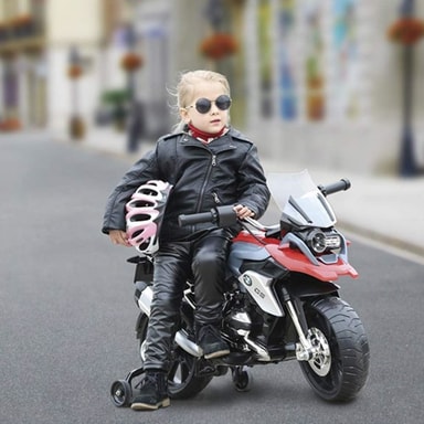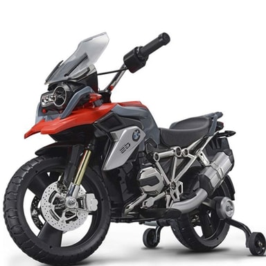 Känn behovet - behovet för fart: ROLLPLAYs BMW R1200 GS Motorcykel har det ikoniska utseendet av en BMW-maskin ända ner till kromdetaljerna! En miniversion av den äkta varan! Perfekt till 3-8 åriga. Stödhjulen hanterar balansen, så ditt barn kan dra iväg och köra med hastigheter på upp till 4,5 km/t. Strålkastare, autentisk instrumentbräda och fodrat säte ger en ännu mer realistisk motorcykelupplevelse. Barn i åldern 3 år och uppåt kör i stil och säkerhet tack vare de extra stödhjulen och halksäkra gummiremsorna på däcken. Det vridbara gashandtaget gör motorcykeln mycket enkel att hantera för de unga motorcyklisterna.