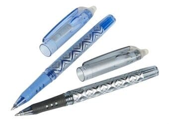 Pennor med suddbart bläck! Fungerar på alla typer av papper. Radera bläcket med friktion! Perfekt till korsord och sudoku men även praktiskt att använda i kalendrar och almanackor outslitlig radertopp skriver följsamt med kulspetsen, radera med upphettande friktion utan att skada papperet och börja om direkt. Radertoppen är outslitlig. Går att radera! Perfekt som korsordspenna. Skönt gummerat grepp och radertopp. Med lock för att inte torka ut bläcket med dessa bläckpennor kan du skriva, radera och korrigera om och om igen. Set med 2 st blått bläck, osorterad färg på pennhöljet.