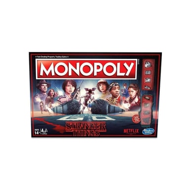 I detta Monopol-spel inspirerat av Netflix Original Series, Stranger Things, har Will Byers försvunnit. Spelare väljer en 80-talsinspirerad token eller en "rippad från upp och ner" för att flytta runt på brädet och försöka hitta honom. Låtsas att du söker igenom staden Hawkins och köper, säljer och byter platser och fordon från showen. Spelet innehåller Walkie-Talkie och Blinking Lights-kort, som ersätter Community Chest och Chance-kort, medan Forts and Hideouts ersätter hus och hotell. Vem kommer att vinna spelet och undvika att bli instängd i "Upside Down?"