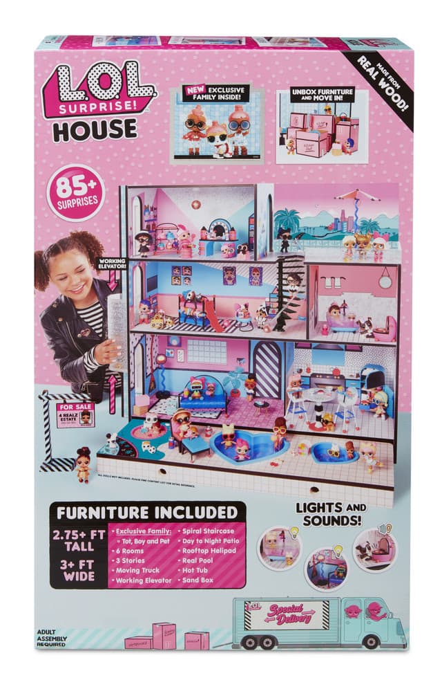 L.O.L Surprise dockhus är det perfekta stället att umgås för L.O.L Surprise! dockorna. Packa upp över 85 olika överraskningar, bland annat en flyttbil och flyttlådor med möbler. Huset är gjord i trä och har ljus och ljud. Det innehåller bl.a. en trädgård, helikopterplattorm på taket och spiraltrappa som annars kan du använda hissen för att få dockorna upp och ner på våningarna i huset. Framför huset är det ett spa, sandlåda och en hjärtformad svimmingpool, som du kan komma vatten i. Det medföljer en helt ny, exklusiv familj som består av en L.O.L Suprise docka, Lil Sister och Pet. Batterikrav: 6 x AG16 batterier (ingår) och 3 x AG3 battier (ingår). Från 3 år.