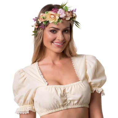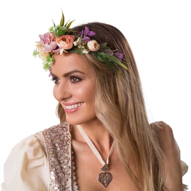 Den exklusiva blomsterkransen Alpenglühen är ett blickfång som passar för många tillfällen. Denna eleganta huvudbonad övertygar med sin naturlighet och de omsorgsfullt bearbetade detaljerna. Med satinbandet kan storleken anpassas individuellt. Den storslagna blomsterkransen Alpenglühen ger din outfit det där lilla extra, Material: plast, textil.