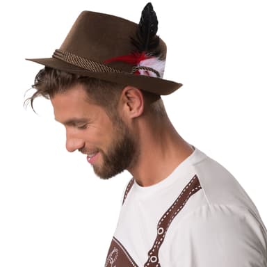 Gör din Oktoberfest-outfit komplett med den bruna traditionella bayerska hatten med fjäder. Denna eleganta och autentiska huvudbonad finns tillgänglig i en universell storlek för vuxna. Inbuktningarna och det breda brättet understryker den traditionella looken. Med den här snygga hatten kan det roliga börja, Material: 100 % polyester.