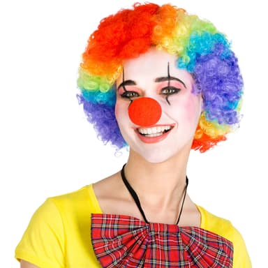 Med en trendig och fräck clownperuk blir du ett uppskattat inslag på alla maskerader, på halloween eller temafester. Den korthåriga peruken med vilda lockar får dig att se fantastisk ut och är garanterat en ovanlig förändring. Peruken passar utmärkt till våra färgglada och lustiga clowndräkter.
