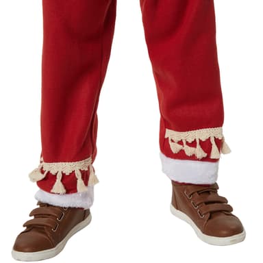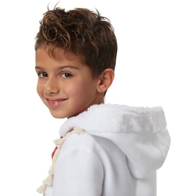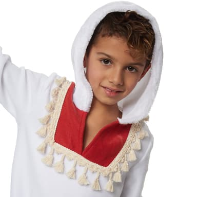 Pojkdräkten Cool eskimåpojke är vit och röd. Den detaljrika överdelen består av en tröja med huva. Vit plysch med röda kantband är fäst vid ärmsluten och vid fållen. Den påsydda huvan är också generöst kantad med vit plysch. Halsområdet pryds av röd, kvadratiskt påsydd sammet och en bård som ser virkad ut med tofsar. Sammetsbyxorna har resår i midjan och nedtill också en bård som ser virkad ut med tofsar. Byxbenen avslutas precis som överdelen med vit plysch och röda kantband, material: 100 % polyester.