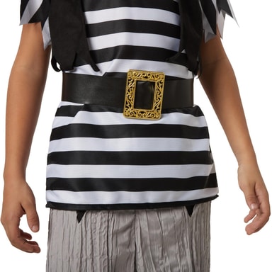 Pojkdräkten Djärv pirat består av byxor i två lager med resår. Det undre lagret består av långa satinbyxor och satinlagret ovanpå ser skrynkligt ut, har hål och avslutas med ett fransigt mönster. Överdelen är en kortärmad tvärrandig tröja med fransigt mönster i ärmsluten. Över detta finns en påsydd kort, ärmlös väst som framtill också avslutas med ett fransigt mönster. Vid nacken finns ett kardborreband. Dräkten avrundas med ett skärp med gyllene spänne, material: 100 % polyester.