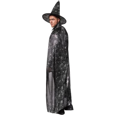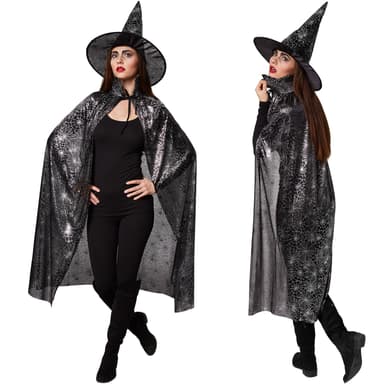 Setet består av en underbart vacker hatt och en förtjusande cape med silverfärgat spindelväv-tryck, material: 100 % polyester.
