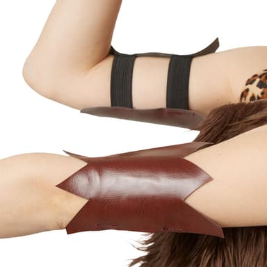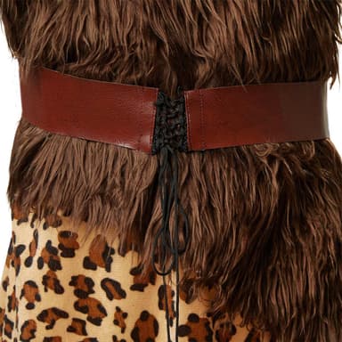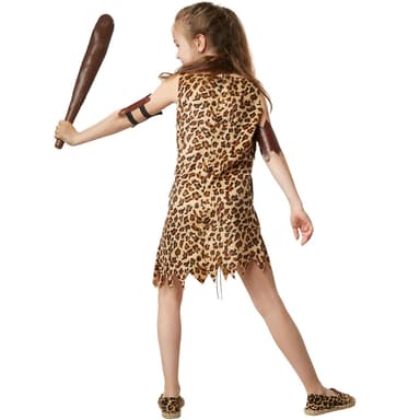 Flickdräkten Elegant stenåldersflicka består av en kort klänning med väst och armmanschetter. Den ärmlösa klänningen har ett asymmetriskt snitt och leopardmönster med fåll i taggigt snitt. Den påsydda ärmlösa västen fram har också ett asymmetriskt snitt, fuskpäls och ett antytt bälte med snörning. Tack vare en dragkedja i ryggen är det lätt att kliva i och ur dräkten. Armmanschetterna är av fuskläder med taggigt mönster och har gummiresår för att sitta perfekt, material: 100 % polyester.
