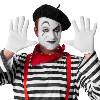 För den perfekta finishen står de ikoniska accessoarerna: Vita handskar understryker varje gest, röda hängslen sätter en stilfull accent och den mönstrade röda halsduken ger outfiten en raffinerad touch. Looken fulländas av den svarta baskern – kännetecknet för varje äkta pantomim.