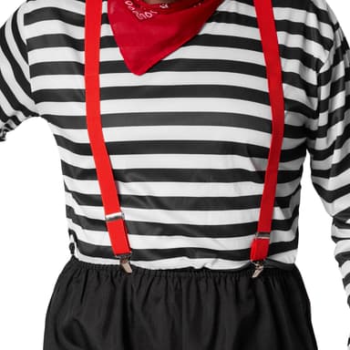 För den perfekta finishen står de ikoniska accessoarerna: Vita handskar understryker varje gest, röda hängslen sätter en stilfull accent och den mönstrade röda halsduken ger outfiten en raffinerad touch. Looken fulländas av den svarta baskern – kännetecknet för varje äkta pantomim.