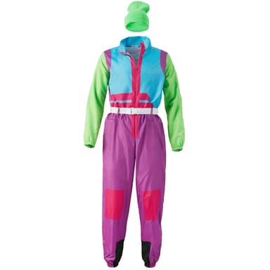 De vilda 80- och 90-talen lever upp igen! Med herrkostymen Retro Ski Anzug blir du blickfånget på varje fest. Overallen i lysande färger som lila, blå, grön och rosa är den perfekta följeslagaren för fastlag, karneval eller en färgsprakande temafest. Setet kompletteras med en neongrön mössa som fulländar din look.