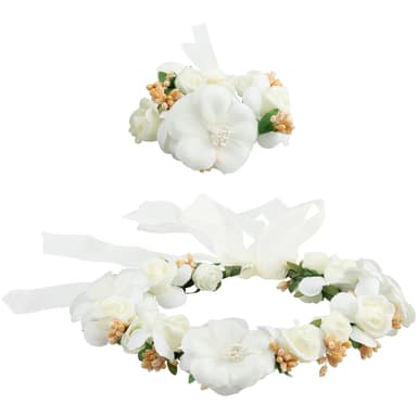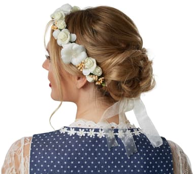 Detta exklusiva bröllopsset med blomsterkrans och armband är ett blickfång som kan bäras vid många tillfällen. Denna eleganta armprydnad övertygar med sin naturlighet och de omsorgsfullt bearbetade detaljerna. Med satinbandet kan storleken anpassas individuellt. Det storslagna bröllopssetet Hochzeit ger din outfit det där lilla extra, Material: plast, textil.
