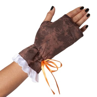 Damdräkten Kvinnlig Steampunk-äventyrare består av en färgglad klänning med kort ärm och kjol i tre delar. Underkjolen är av tyll, de båda övre lagren av mjuk sammet och fin satin. Dräkten har en läderliknande överdel. Framtill finns en korsett med antydd snörning och gyllene dekorationer. Dekolletaget har volanger och avgränsas upptill av en krage. I ryggen finns en dragkedja. Dessutom medföljer handledsvärmare av konstläder med rosetter och sammetsinsats, material: 100 % polyester.